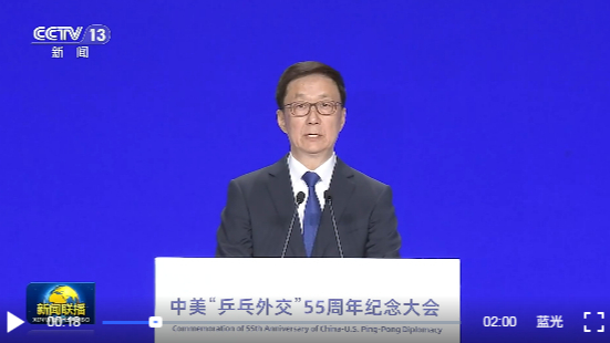 တရုတ်-အမေရိကန် "စားပွဲတင်တင်းနစ်သံတမန်ရေး" ၅၅ နှစ်ပြည့် အထိမ်းအမှတ် အခမ်းအနားနှင့် တရုတ်-အမေရိကန် လူငယ်များအားကစားဆိုင်ရာ ကူးလူးဖလှယ်ရေးလှုပ်ရှားမှု ဖွင့်ပွဲအခမ်းအနားကို ဟန်ကျန့် တက်ရောက်ပြီး မိန့်ခွန်းပြောကြား